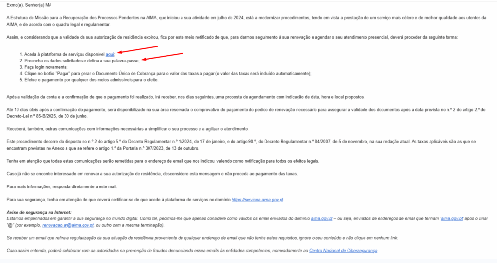 1 – Irá receber um email da AIMA para poder pagar a taxa e criar a palavra-passe para o portal.