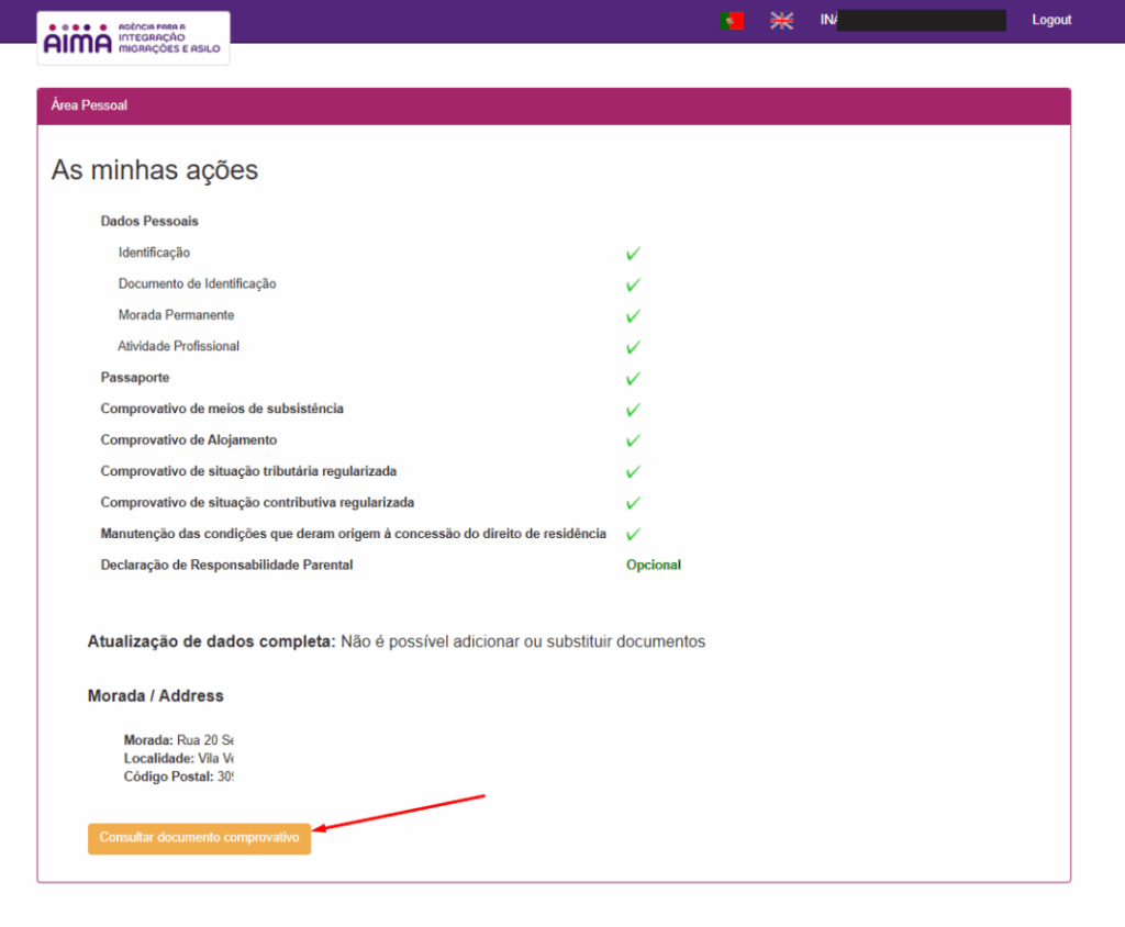 4 – Após submeter seus documentos e ir a AIMA o seu portal ficará dessa forma. E você poderá solicitar o comprovativo que renovou sua residência. Clique em CONSULTAR DOCUMENTO COMPROVATIVO.