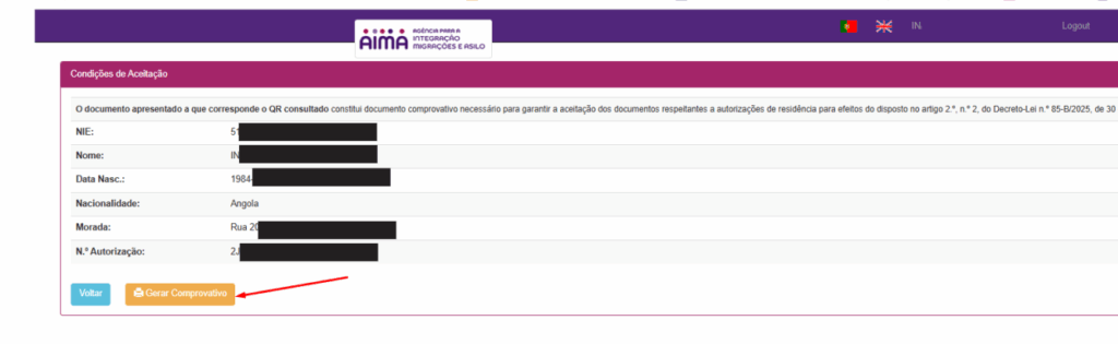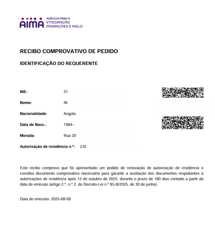 Após submeter os documentos a AIMA irá fazer uma primeira verificação e depois será disponibilizado o Recibo do PEDIDO DE RENOVAÇÃO.